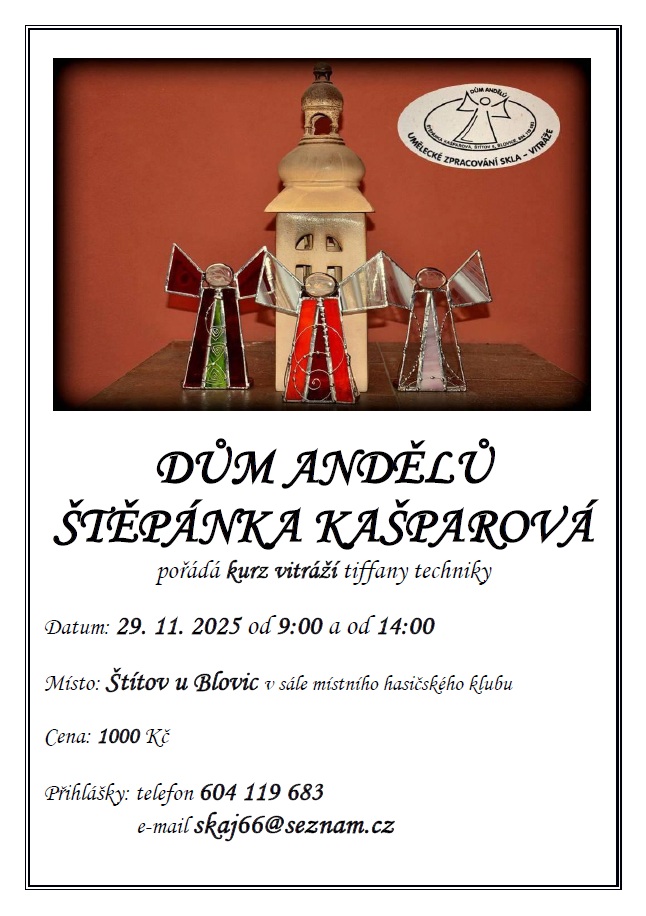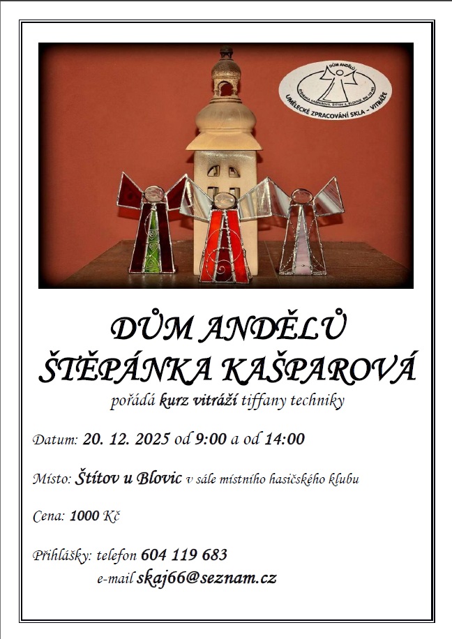 Předvánoční kurz Tiffany vitráží – poslední letošní termín 26.11.2025 Dům andělů a Štěpánka Kašparová vás srdečně zvou na předvánoční kurz Tiffany vitráží, který proběhne 20. prosince 2025 ve Štítově u Blovic, v sále místního hasičského klubu.