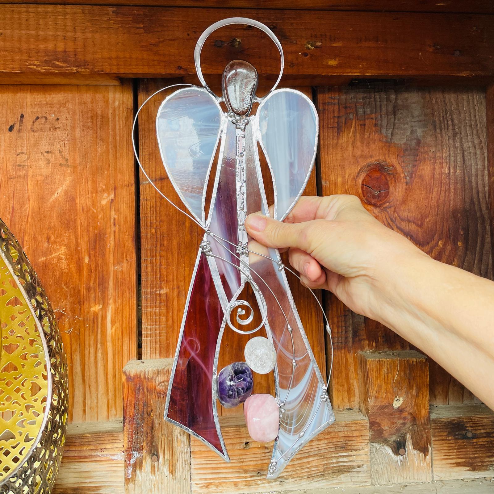 Velký růžovobílý anděl je velmi žádaný typ díky svým rozměrům, které krásně zvýrazňují kresbu skla. Tělo anděla je zdobeno třemi kameny – pukaným křišťálem, ametystem a růženínem. Dekoraci doplňují cínovaná spirálka a jemné drátky. Finální úprava byla provedena antioxidačním olejem, který chrání povrch a podtrhuje jemné barevné odstíny.