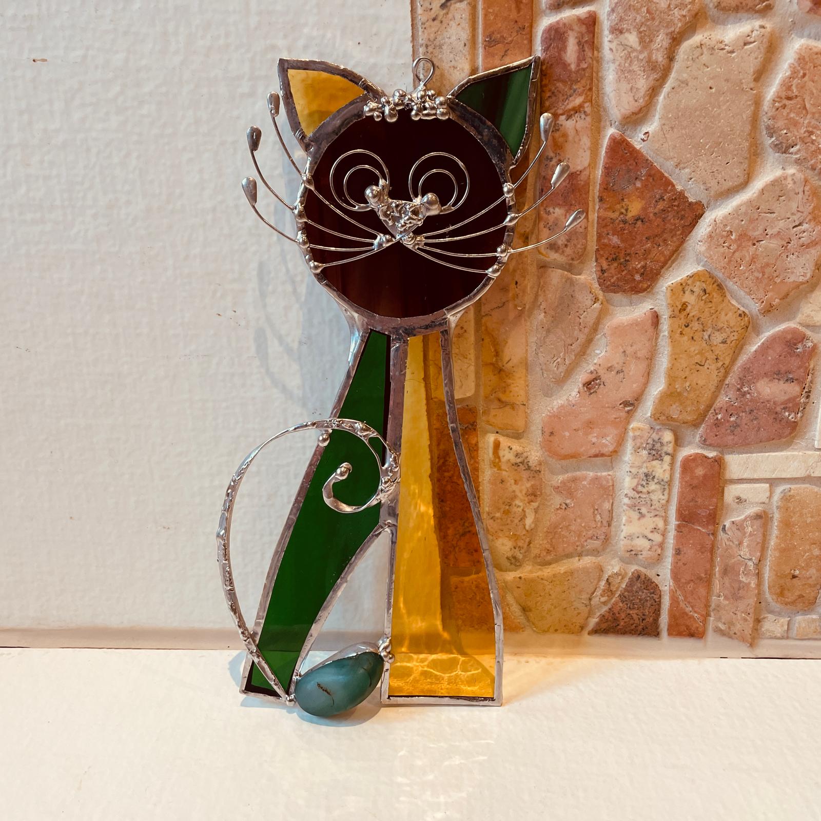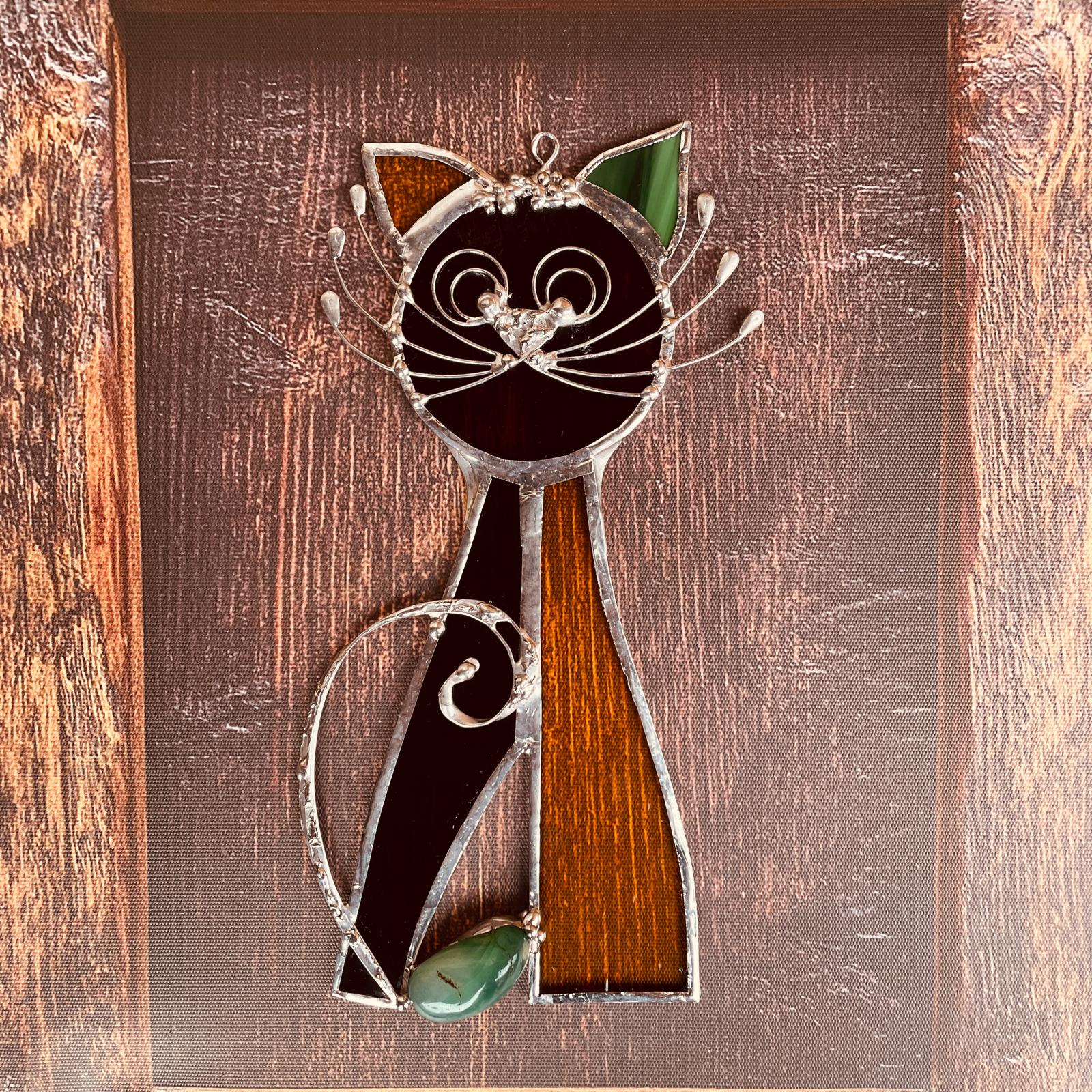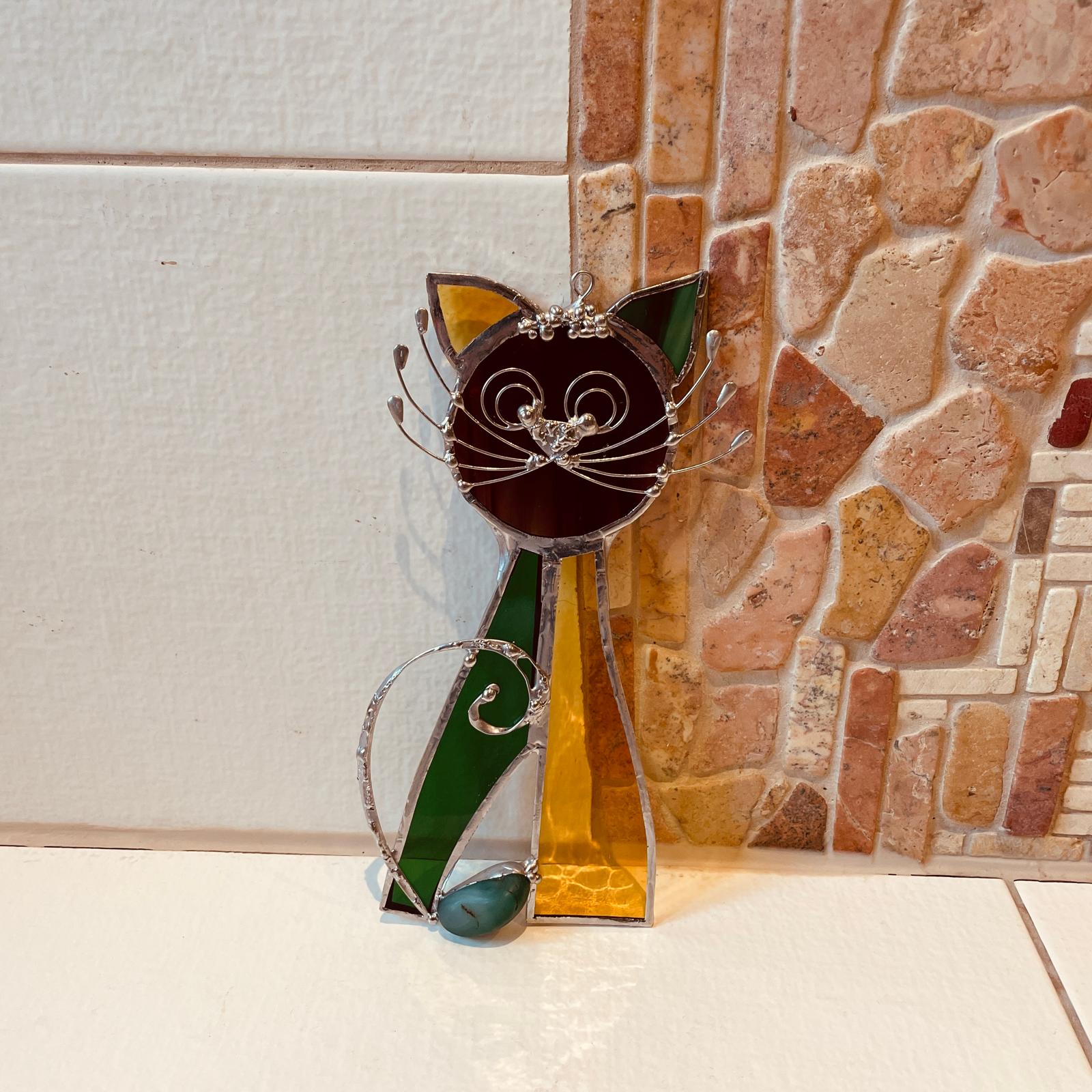 Vitrážová kočka z hnědého burgundy skla, zeleného poloopálového skla a žlutého transparentního (čirého) skla je výrazným a přitom harmonickým doplňkem interiéru. Díky svému zpracování vnáší do prostoru klid, rovnováhu a jemnou energii přírody.